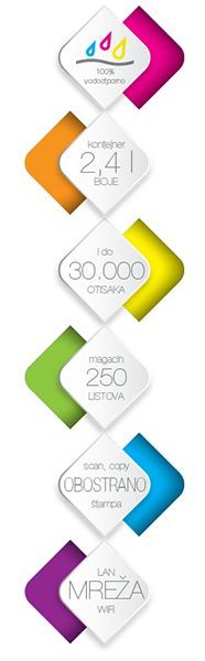 HP Multifunkcinalnom uređaju dodali smo sistem kontinuiranog štampanja. Nudimo veoma kvalitetno pigmentno mastilo (u boji i crno), vodootporno, koje pravi kvalitetne slike. Nije potreban servis, u slučaju kvara menjamo čitavu mašinu za novu. Naša inovacija su kontejneri sa mastilom koji omogućavaju veliki obim štampanja bez zamene kontejnera. Vaša jedina obaveza je da dopunjavate kontejnere sa mastilom.